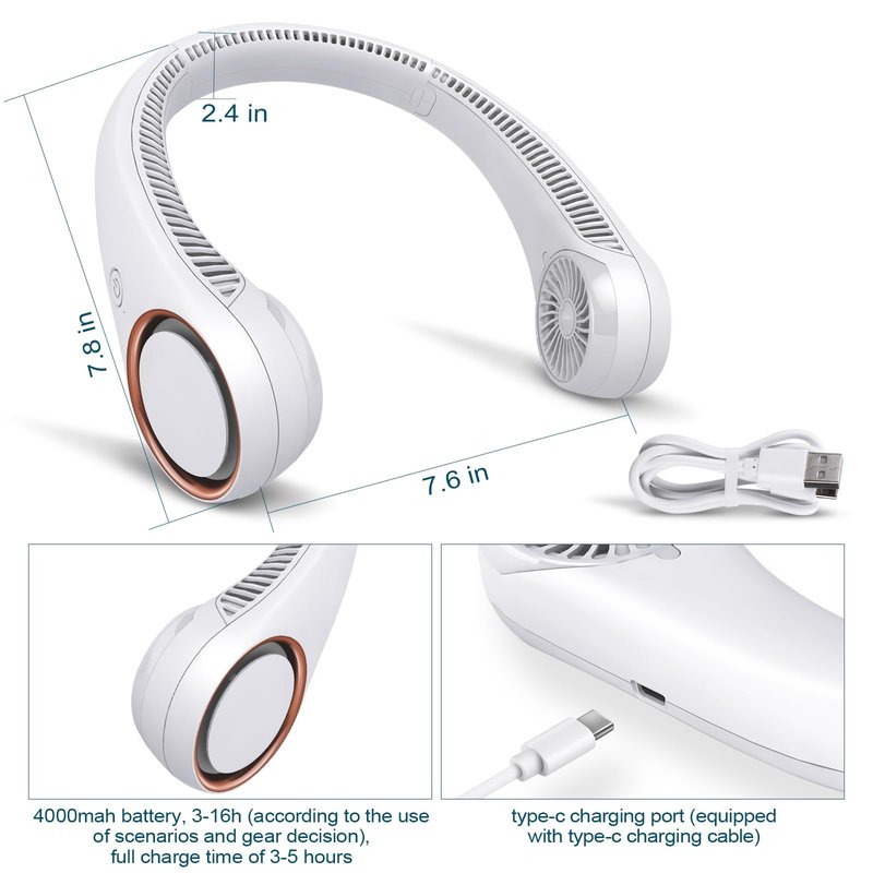 Battery Endurance: 4000 mAh battery operated wearable personal fan, the endurance is about 3-16 hours. (The length of use depends on different wind speeds)