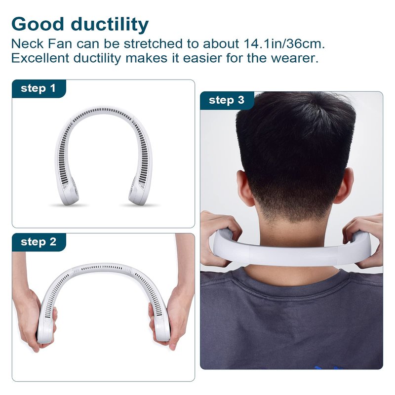 - Low noise and comfort: Excellent upgraded technology with multi-stage air duct design greatly reduces fan noise. Made of ABS and silicone, it is natural to wear, comfortable and skin-friendly. Wearing the neck fan can also study or work without worry