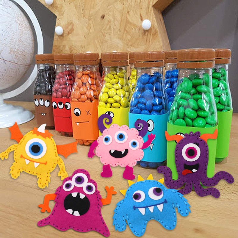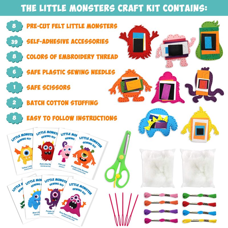 - MAKE YOUR OWN LITTLE MONSTERS: This is a complete kit- no need to buy anything else! Contains 8 pre-cut felt little monsters, 39 self-adhesive accessories, 8 colors of embroidery thread, 6 safe plastic sewing needles, 1 safe scissors, 2 batch cotton stuffing, 8 easy to follow instructions, 1 drawstring bag for easy storage. Get ready for lots of fun with our little monster craft kit.