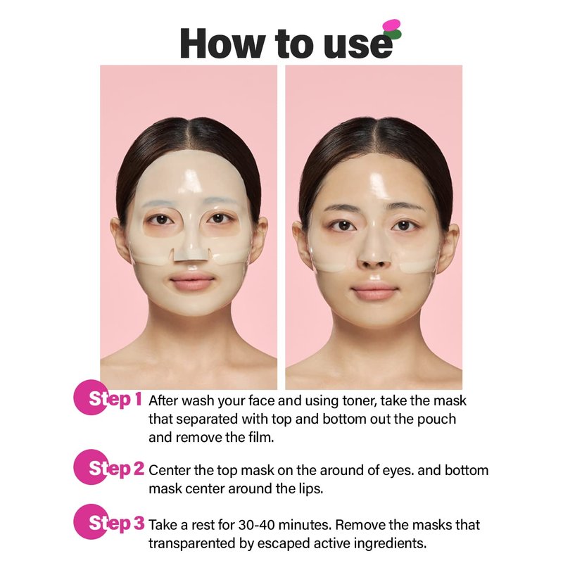 - HOW TO USE: After cleansing and refining skin texture with a toner, take out top/bottom masks and remove films. Position top mask around eyes and bottom mask around mouth. After 30 minutes, the active ingredients will be absorbed, causing the mask to become transparent. Remove them and pat remaining essence into skin.