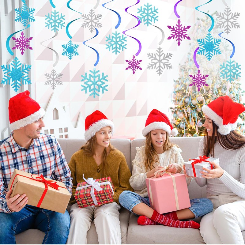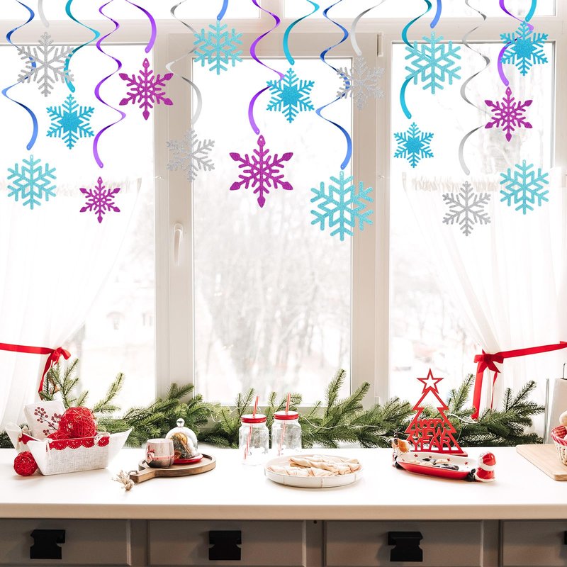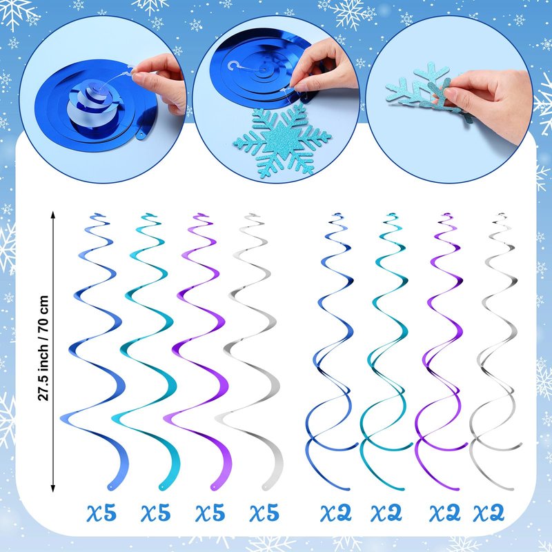 - Package Information: our hanging snowflake swirls decorations consist of 20 pieces of snowflake cards, including 5 purple snowflakes, 5 silver snowflakes, 5 blue snowflakes and 5 green snowflakes, 20 single hanging swirls and 8 double hanging swirls