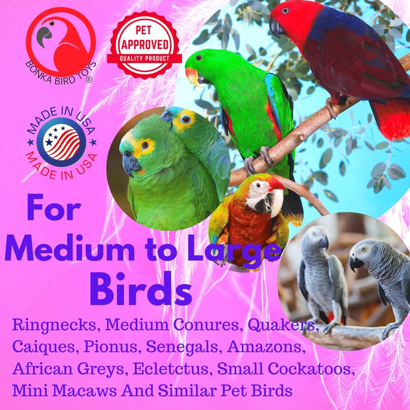 - This bird toy includes a heavy duty quick link connector for fast and easy hanging from the pack.