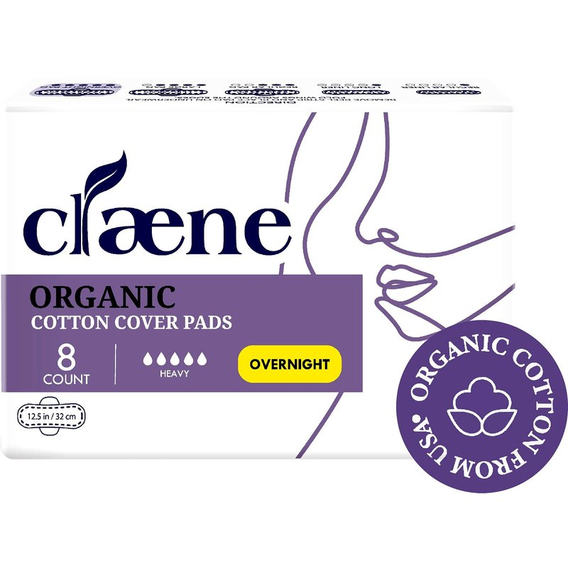 Claene Organic Cotton Cover Pads, Cruelty-Free, Menstrual Overnight Pads for Women, Unscented, Breathable, Vegan, Natural Sanitary Napkins with Wings (Overnight, 1 Pack, Total 8)