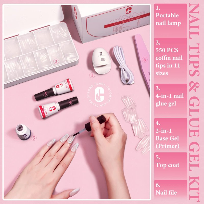 - 【VALUABLE FALSE NAIL KIT】:Clara Colors Nail Tips & Glue Gel Kit includes Primer 7ml*1, Soft Gel Adhesive 7ml*1,Top Coat 7ml*1,Coffin nails*550,USB portable nail lamp*1,Nail Buffer*1.Satisfy all your needs in the nail art process,file the nails,stick the nail tips,curing the nails.