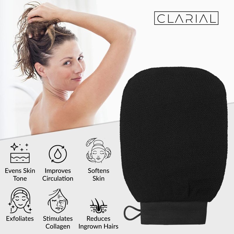 Clarial Exfoliating Body Scrub for Bath & Shower Use - Face Scrubber & Body Exfoliator for Dead Skin Remover - Korean Exfoliating Glove Shower Scrub for Men and Women - Pair All Black