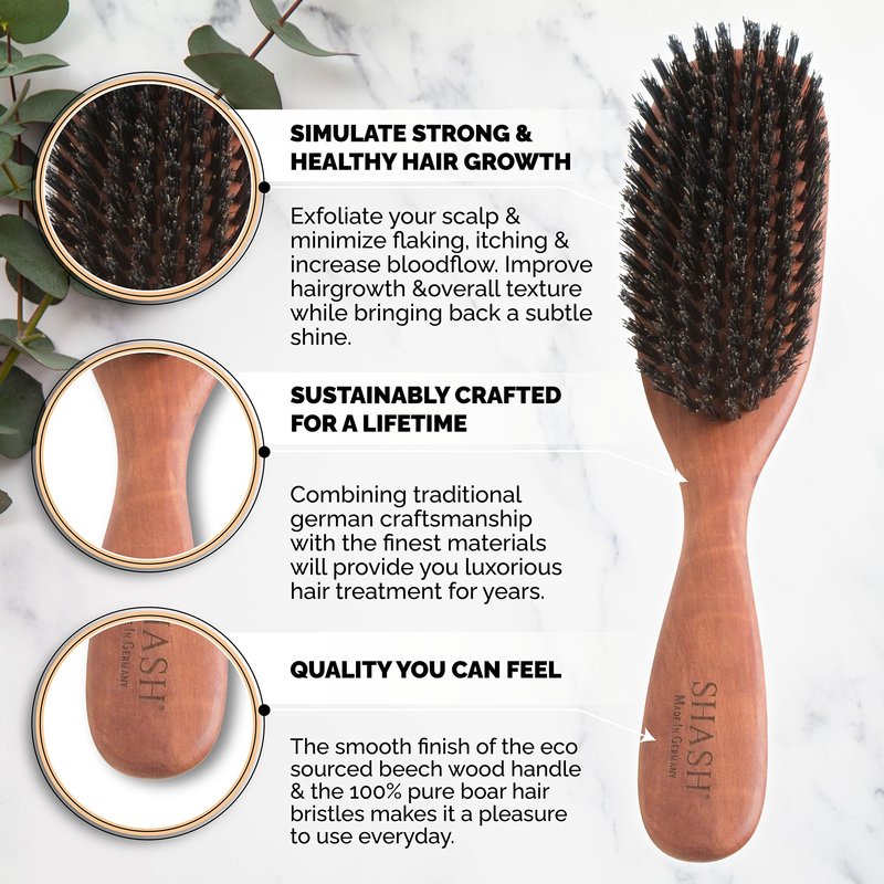 - Made in Germany: Crafted with 100% pure boar hair, our bristle brush delivers quality you can trust! The beech wood handle is ecologically sourced and finished with a nut wood varnish, providing you with world-class workmanship you’ll use for years.