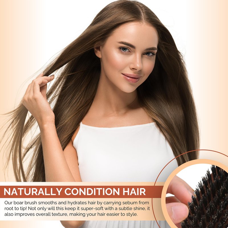 - Naturally Condition Hair: Fighting frizz? Our boar brush smooths and hydrates hair by carrying sebum from root to tip! Not only will this keep it super-soft with a subtle shine, it also improves overall texture, making your hair easier to style.