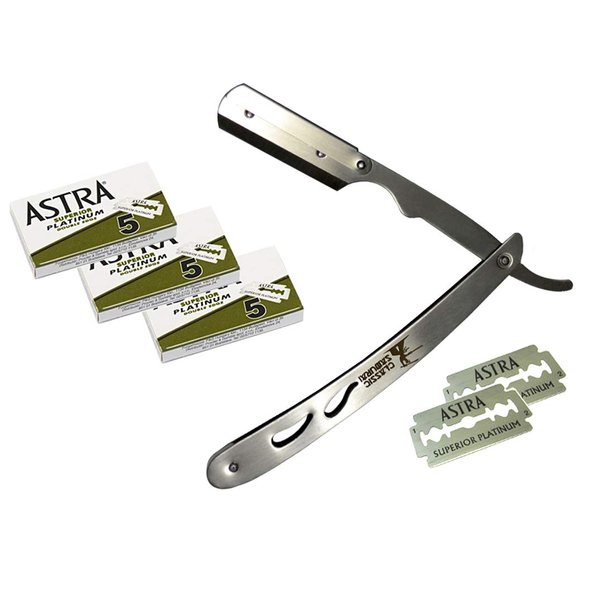 Classic Samurai CS-102 Stainless Steel Professional Barber Straight Edge Razor with 15 Astra Double Edge Razor Blades (Silver + 15 Astra Blades)