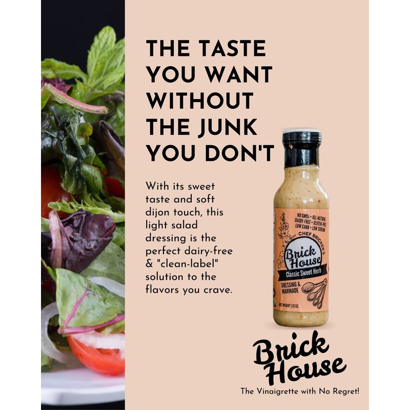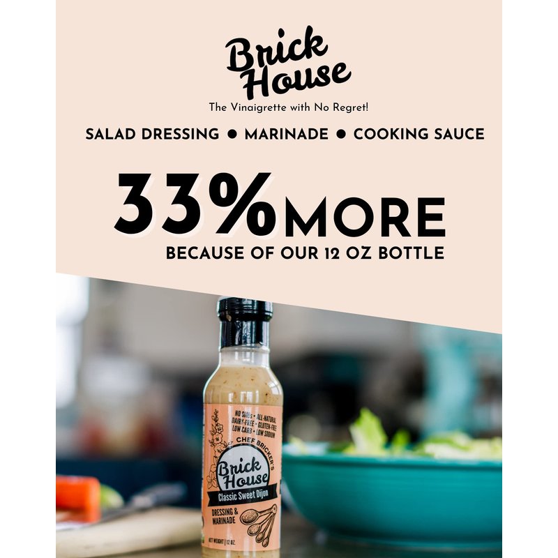 - 🚫 DONT SABOTAGE YOUR SALAD! Other dressings add empty calories, carbs, sodium and other junk to your hard efforts of eating healthy. Brick House is the "Vinaigrette With No Regret." This sweet vinaigrette is low sodium (28mg), low carb (2.5g), low sugar (2.5) and is gluten & dairy free.