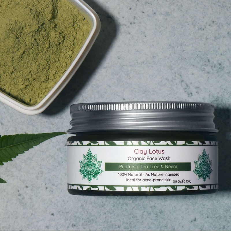 Clay Lotus Organic Face Wash - Acne-Prone, Oily Skin Cleanser with Tea Tree Oil & Neem. All-Natural Ingredients for Blemishes, Redness & Blackheads, Vegan Formula For Teens, Women and Men