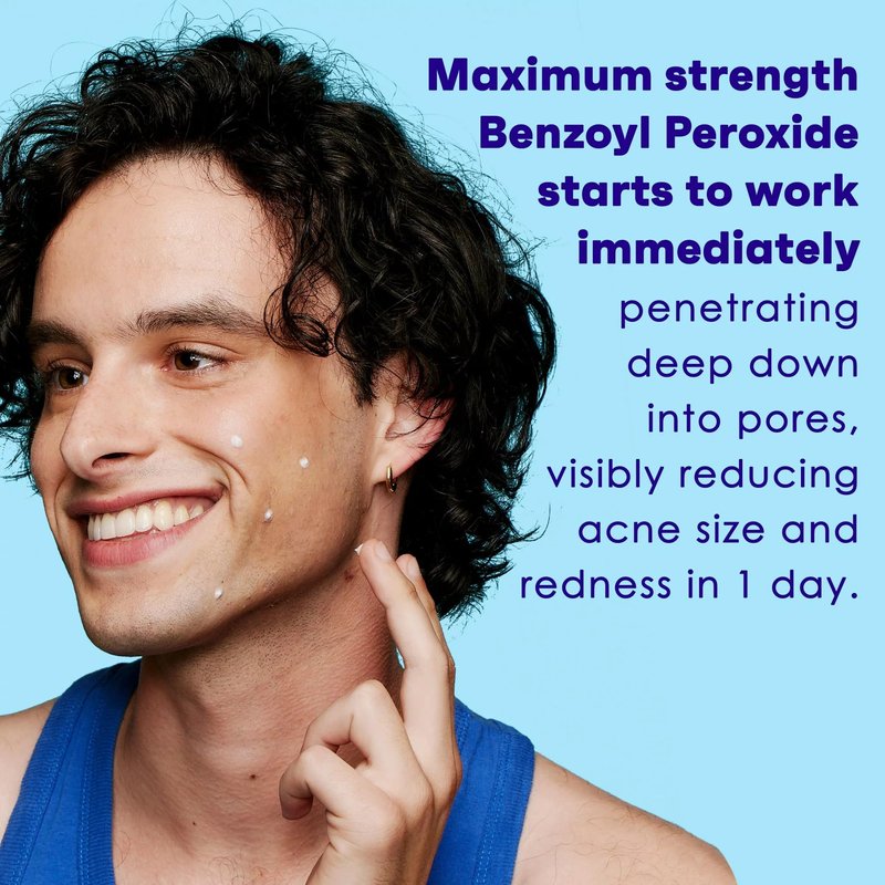 - Spot treatment targets the source of where breakouts begin & visibly reduces acne in just one day Maximum strength acne treatment with benzoyl peroxide visibly reduces blemish size & acne redness
