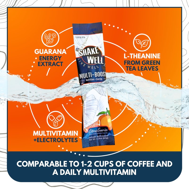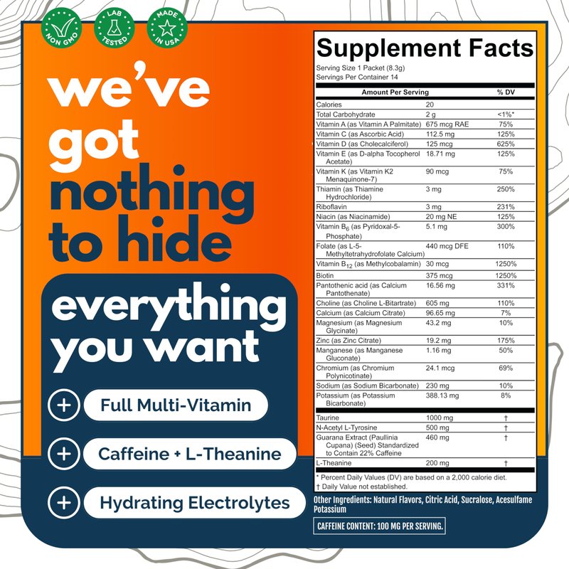 A refreshing and delicious way to start your day! Available in travel-friendly stick packs, our easy, on-the-go drink mix makes getting in 20+ essential nutrients and jitter-free energy the easiest and most enjoyable part of your day. This is the first and only multivitamin drink mix to combine the nutrition content of a full-spectrum multivitamin with rapid hydration power of electrolytes and a smooth energy blend. This is a sustainable way to boost your energy levels with No Added Sugar. No artificial colors. Non-GMO. Infused with naturally occurring Guarana extract, which is a slow release plant-based caffeine, and a complete B-Complex you'll have the resources for all-day energy. This is combined with fully effective doses of L-Tyrosine, L-Theanine, and Taurine that have been shown to mitigate stress and elevate mood. Made with the most bioavailable forms of every nutrient for maximum absorption; we spared no expense.