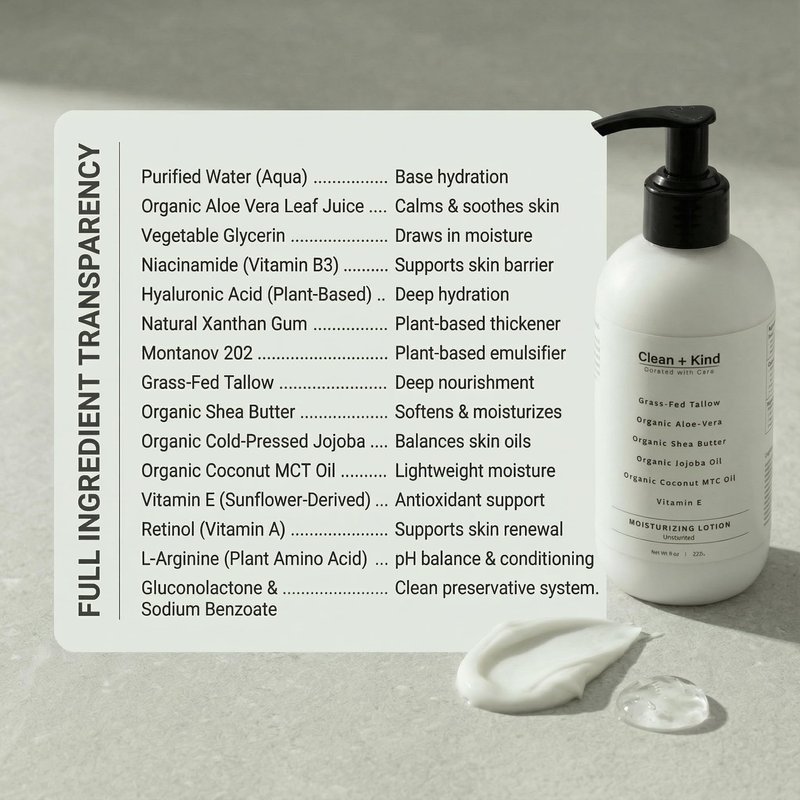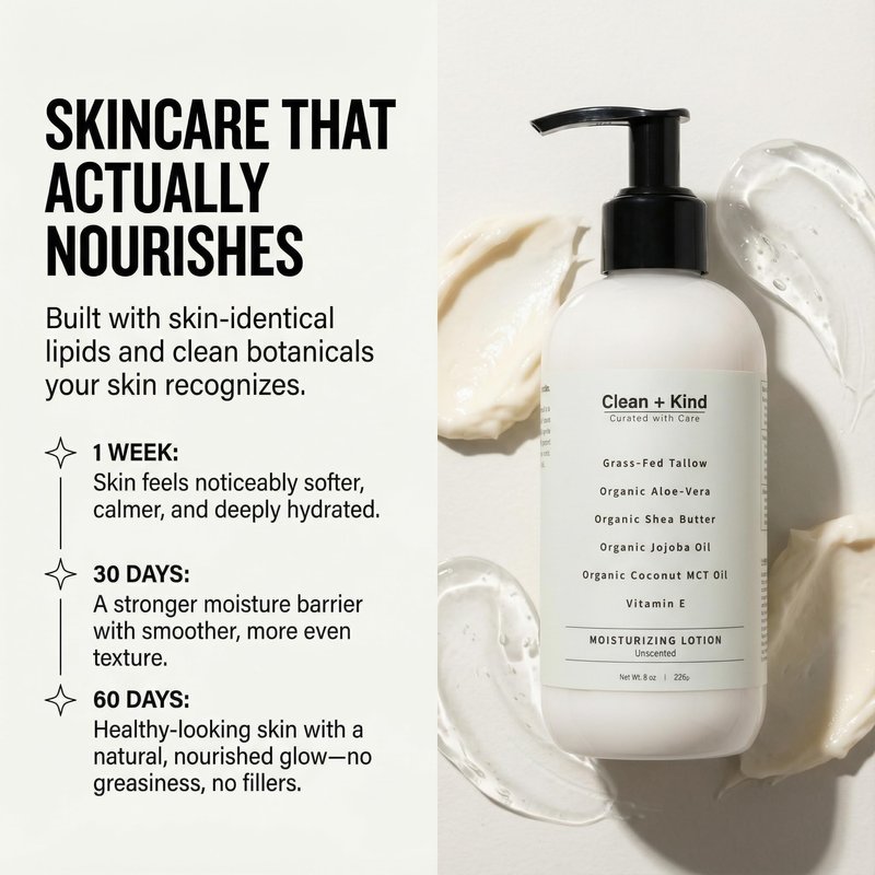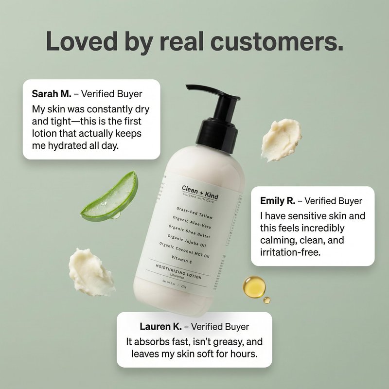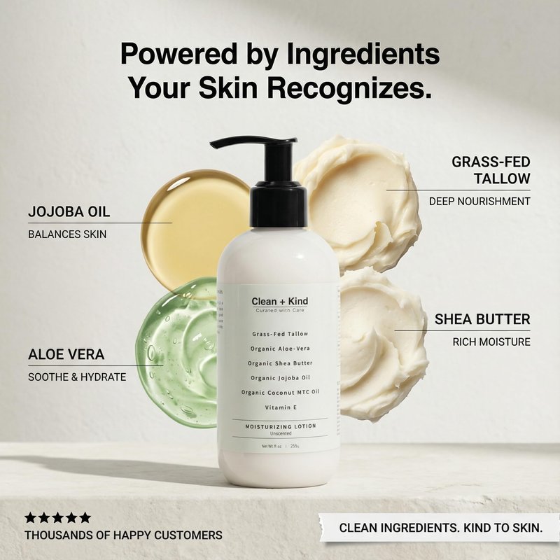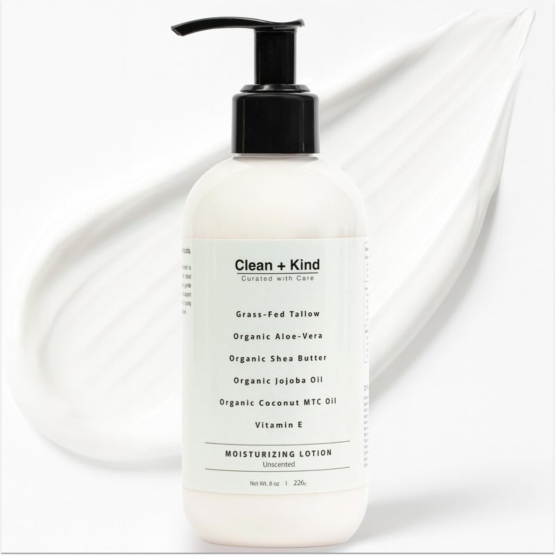 Clean + Kind Daily Moisturizing Lotion is crafted to deeply hydrate, soothe, and protect your skin using only clean, nutrient-rich ingredients. Our unique blend of grass-fed tallow, aloe vera, shea butter, jojoba oil, MCT oil, and vitamin E provides powerful hydration while supporting the skin’s natural moisture barrier. Unlike heavy creams, this lotion absorbs quickly, leaving your skin soft, smooth, and refreshed without greasy residue. Perfect for daily use, it helps improve the appearance of dry, flaky skin, rough patches, and uneven tone, while calming irritation for sensitive skin. Formulated with clean, safe, and transparent ingredients, this lotion is free from synthetic additives, parabens, sulfates, and petroleum. Proudly made in the USA, Clean + Kind brings you a moisturizer you can feel good about using every day.