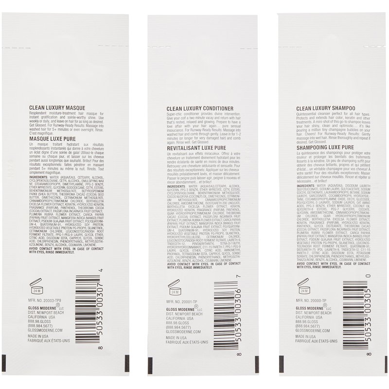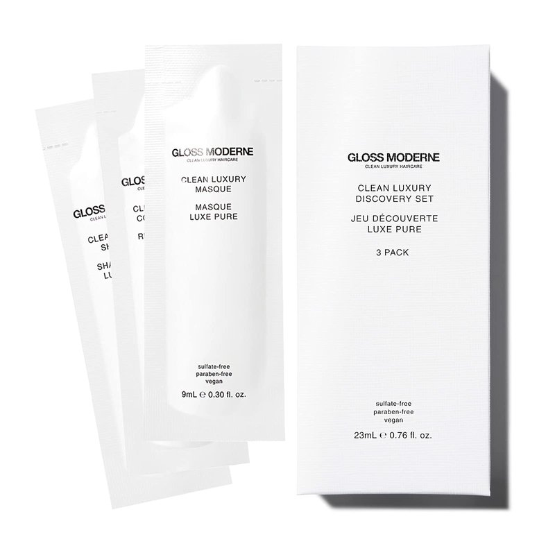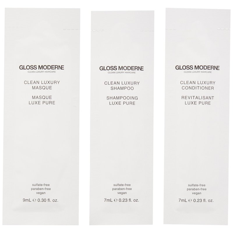 - Discovery Set: Discover the GLOSS MODERNE Clean Luxury Haircare Collection with these travel packettes of our Shampoo, Conditioner and Hair Masque. All products are scented with our Soleil fragrance, a radiant scent that embodies summertime on the beaches of St. Tropez. It’s the perfect way to experience GLOSS MODERNE.