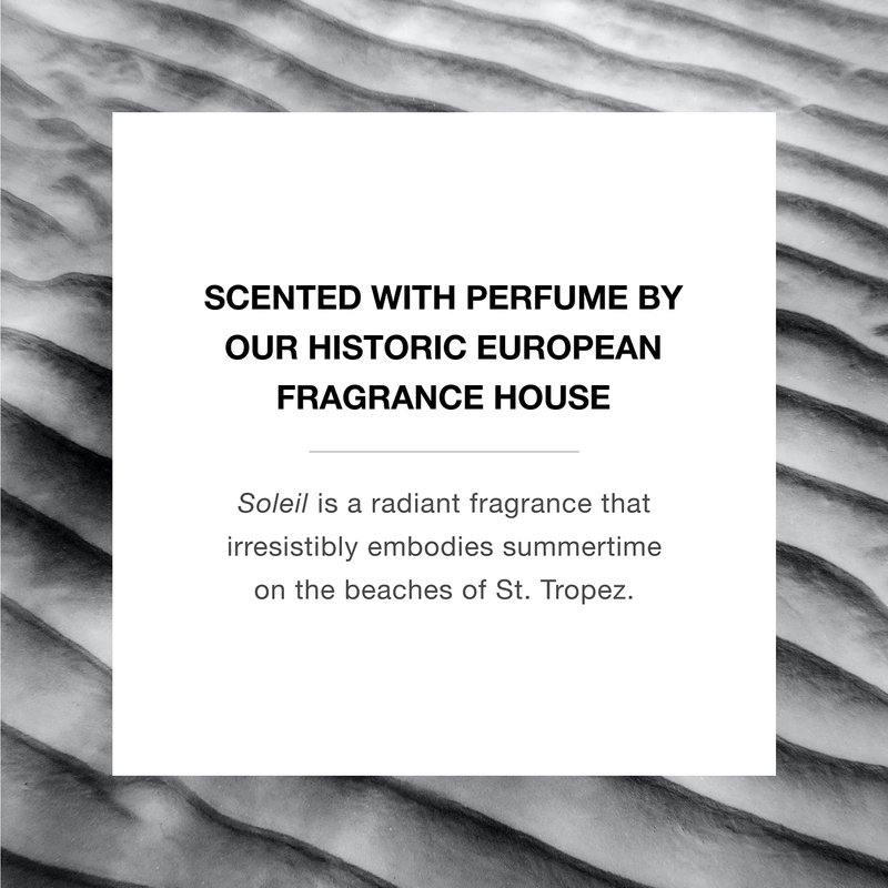 - Soleil Fragrance: This product is scented with Clean Luxury perfume oils created by our historic European fragrance house. Soleil is a radiant fragrance that irresistibly embodies summertime on the beaches of St. Tropez. With notes of Mediterranean almond and coconut accented with cognac, this scent sensorially evokes the warmth of sunlight on the skin.