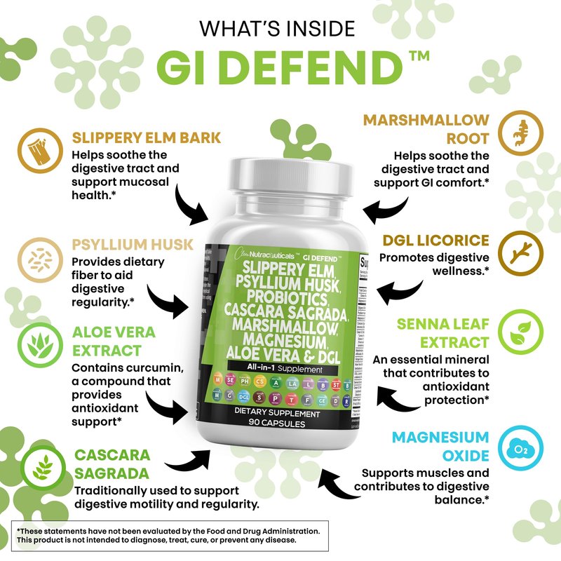 Clean Nutraceuticals Slippery Elm Psyllium Husk Pre Probiotic Digestive Gut Health Supplement with Aloe Vera Cascara Sagrada Marshmallow Root DGL Licorice Senna Extract