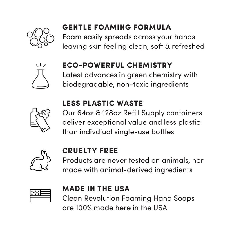 - REFILL & REUSE: We believe in creating less plastic waste and eliminating the need for individual single-use bottles, which is why we also offer Refill Supply 1 Gallon Jugs designed to be used with Clean Revolution Foaming Hand Soap. Sold separately.