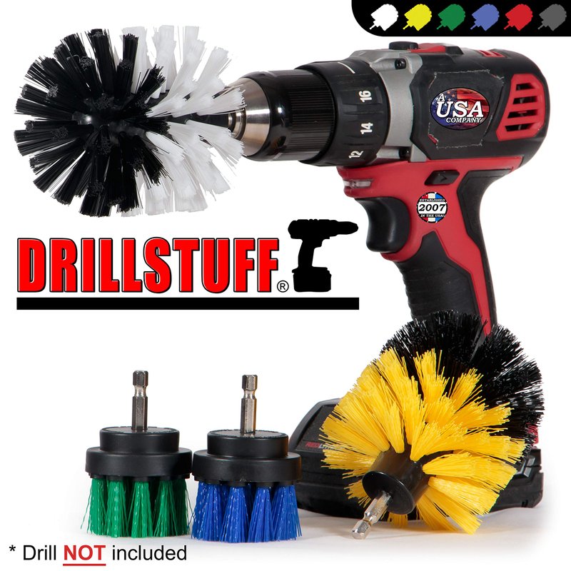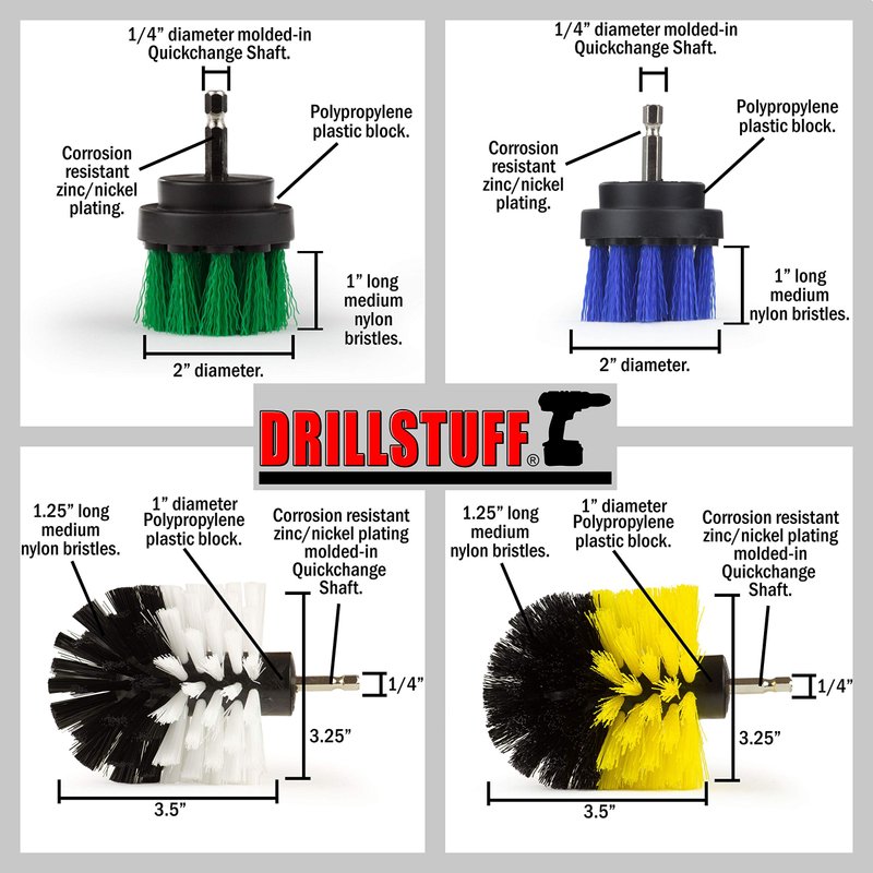 Four piece power scrubber kit for automotive detailing (Soft White corner brush), Boat detailing (Medium Blue 2-inch). Shower and Bathroom cleaning (Medium Yellow corner brush), Kitchen cleaning in crevices and around pipes and fixtures (Medium Green 2-inch). These four brushes have a multitude of uses, and the different sizes and bristle stiffness allow you to pick the right brush for your cleaning tasks.