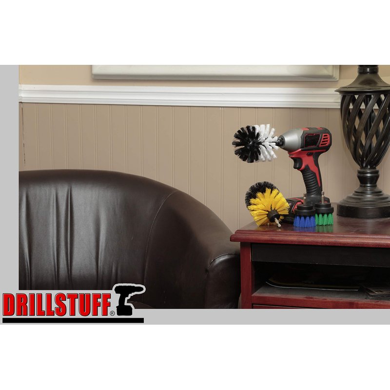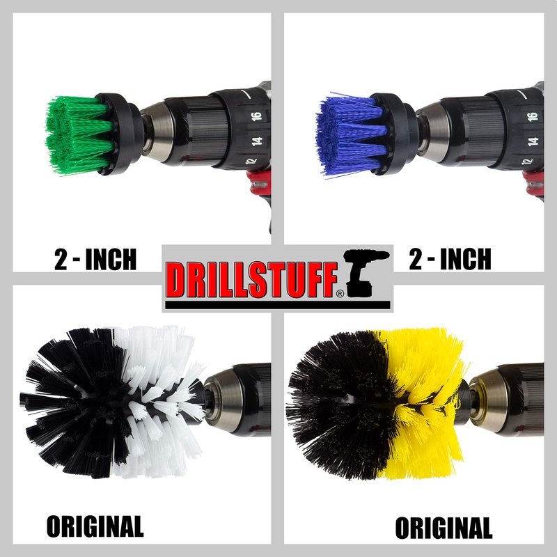 - Four-piece cordless drill scrub brush attachment kit includes two 2-inch diameter crevice brushes in both Medium Green and Medium Blue versions. Two larger 3.25 inch by 3.5 inch multi-use corner brushes in Soft White and Medium Yellow.