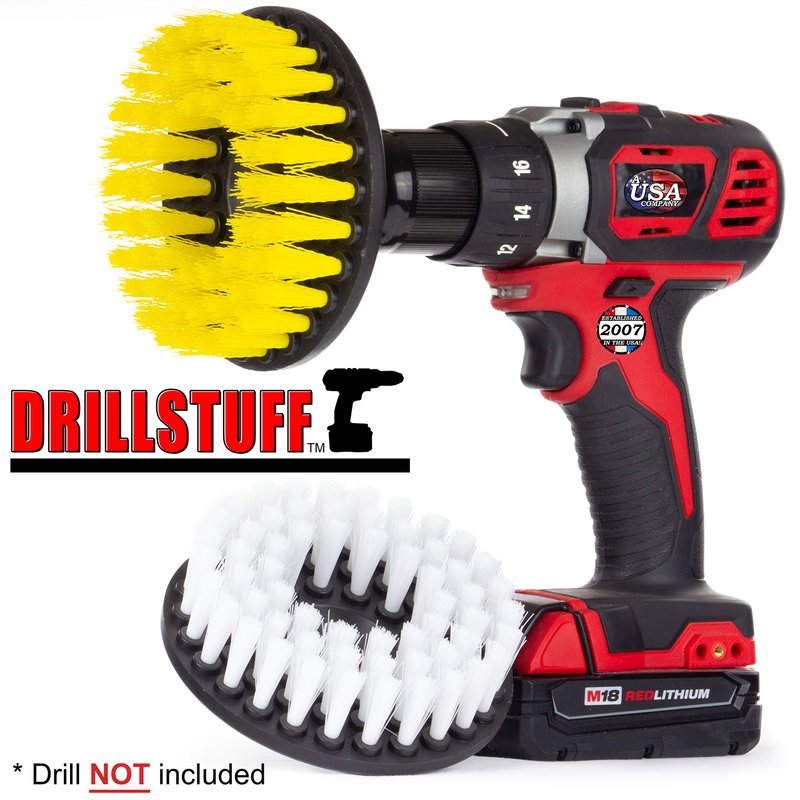 The user controlled power rotation of your cordless drill, combined with this professional quality medium stiffness bristle brush lifts and easily extracts spots from bathroom surfaces, upholstery or carpet. This brush is manufactured exclusively for Drillstuff. The yellow medium bristle brush is meant for rigorous scrubbing of carpets, tub and tile, and flooring. The bristles are stiff enough to dislodge old stains and they will hold up better than the soft carpet brush on heavy duty carpet. You can also use this brush on tiles, grout, and floor pads. It is used for general scrubbing and cleaning of carpets, door panels, RV's, and countless applications in the home. The White brush is perfect for carpet and upholstery cleaning.Cordless drill NOT included Drill NOT included