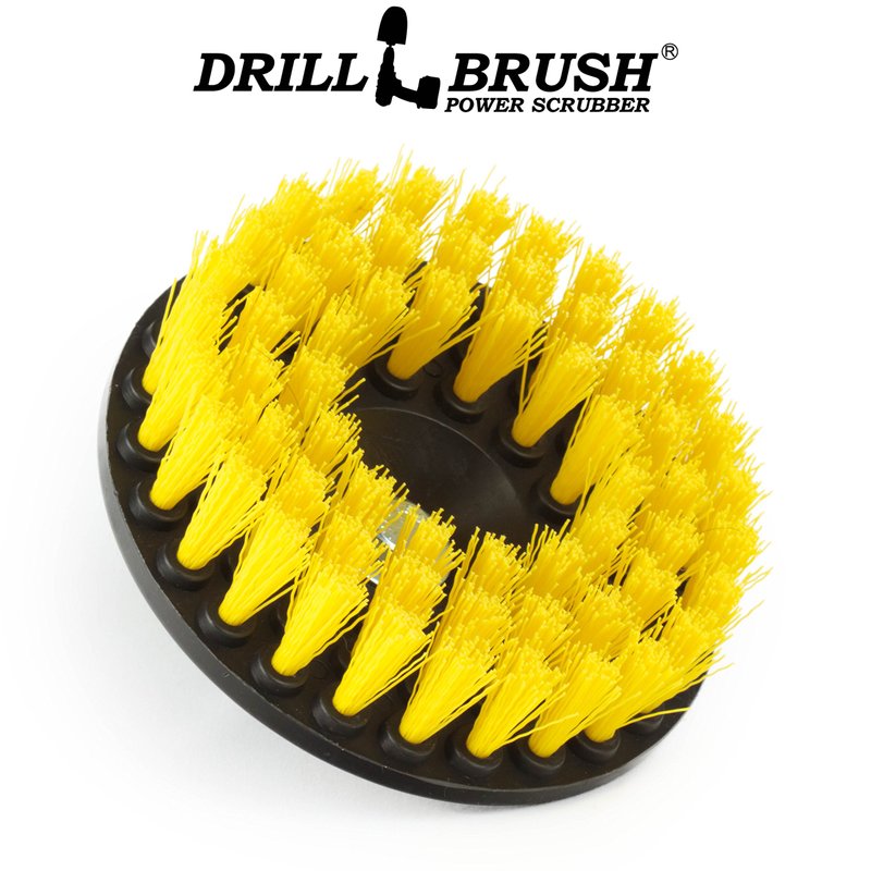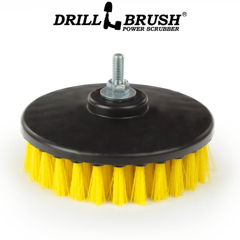 - 5-inch diameter Medium Yellow powered brush kit for cleaning and scrubbing bathroom surfaces. Stuck on soap scum, and water stains got you down? Let our Drillbrush 5-inch threaded flat yellow cut through any cleaning need. This offer includes our most popular 5-inch threaded flat scrub brush, great for cutting into large flat messes with ease. This bathroom cleaning brush will break up any stuck-on stains with ease. This bathroom scrubber brush is perfect for larger areas such as shower walls.