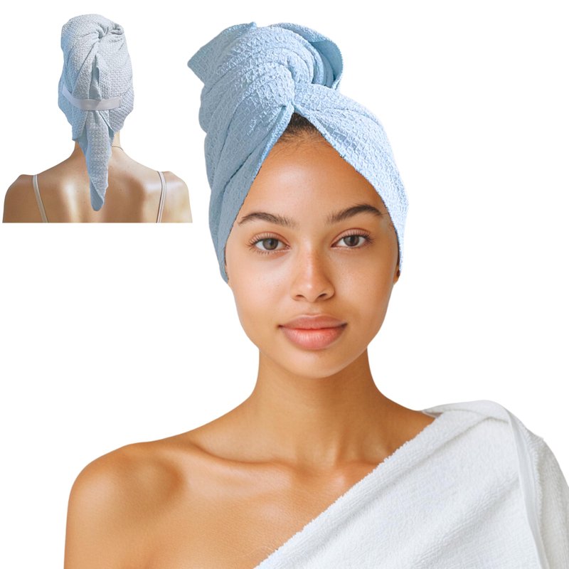 - Comfortable Fit: Designed with a convenient elastic band as opposed to a button loop, the towel stays securely in place and doesn't tug on your hair.