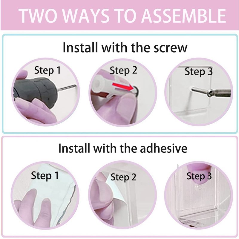 - 【2 Ways Installation Headband Storage】 Our clear acrylic organizers comes with the hardware screws accessories and adhesive wall pads, 2 ways for you to install the headband wall shelf on the wall surface. Tips: Pls make sure the wall is smooth, clean before using the adhesive pad to the wall.