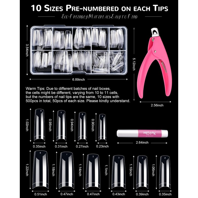 - 【Clear False Nails Set】The fake acrylic nail tip kit includes 500pcs clear nail tips offering 10 different sizes with 50 nails of each size, 1 nail clipper, 5pcs nail glues, 3pcs nail file, 1 nail scraper and 1 cuticle knife.A complete clear nail set meets all your needs for DIY nail art or nail home salon.