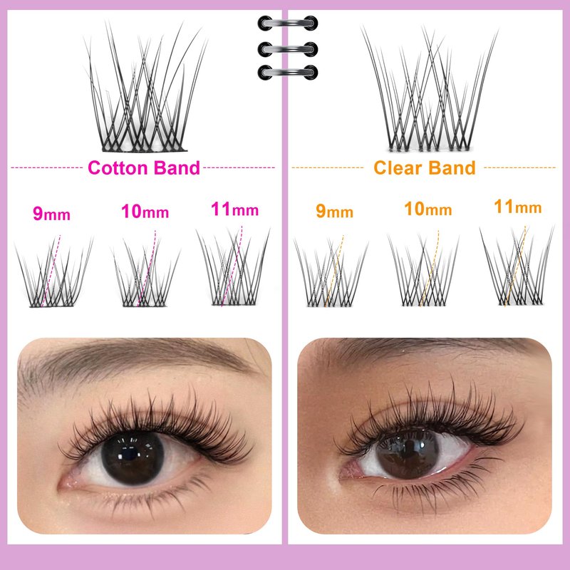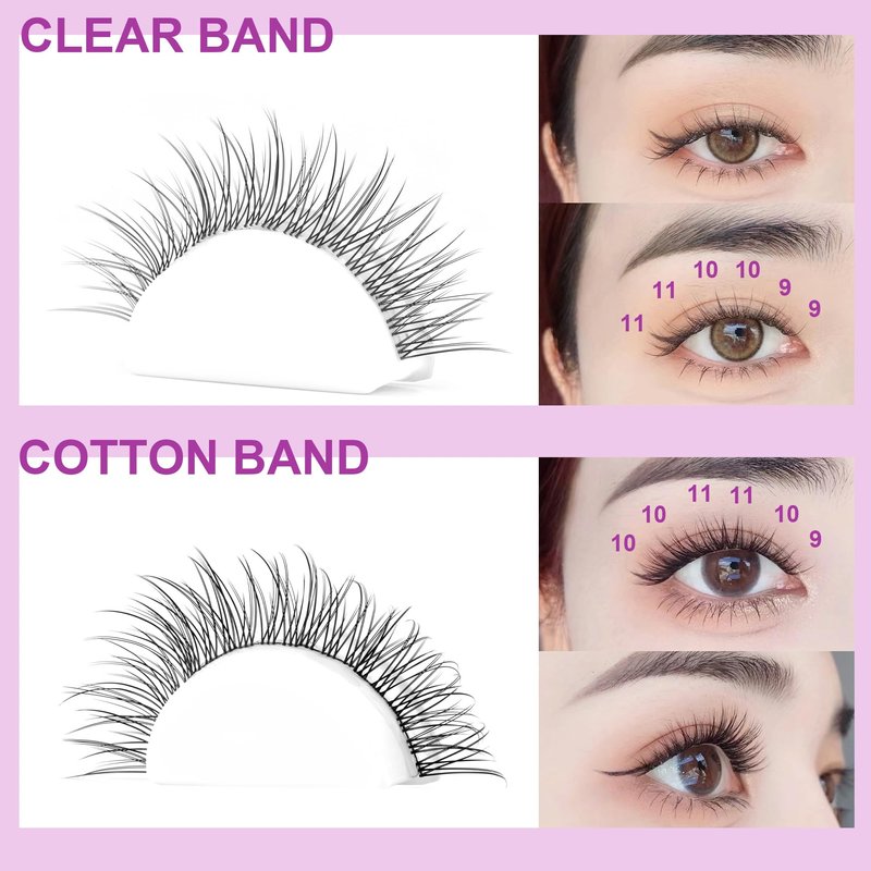 - Clear Band & Cotton Band Lash Clusters Wispy: We provide you with 2 styles super thin but durable and flexible lash band. The clear band lash extensions will perfectly blend into your natural eyelashes, and the eyelash extensions with balck cotton will bring upward eyeliner effect,make your eyes more charming