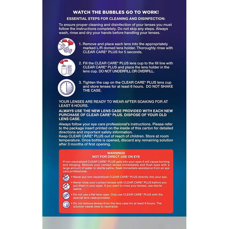 - Never put CLEAR CARE Solution directly in or around your eyes Follow instructions completely and do not skip any steps