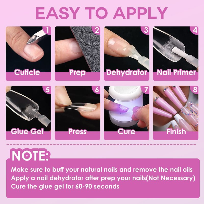 - 【EASY APPLY GEL X TIPS】Apply nail tips with gel nail glue and cure under LED/UV. Thinner tail, easier to fit the nail surface; large area of frosted surface on the tail makes the glue more sticky and not easy to fall off