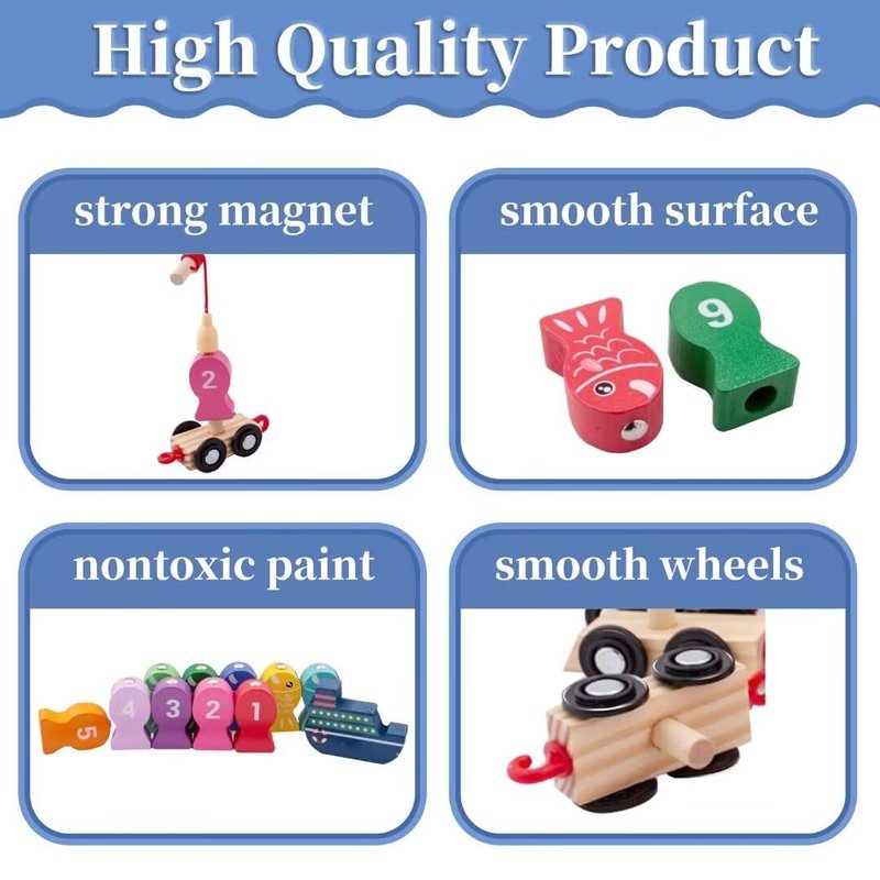- WOODEN MAGNETIC NUMBER FISHING GAME Our wooden magnetic number fishing game, as a montessori wooden number toy offers great happiness for 3-5 years old kids. It comes with number 1-10 fish, 1 wooden magnetic fishing poles and 11 wooden train car bases.