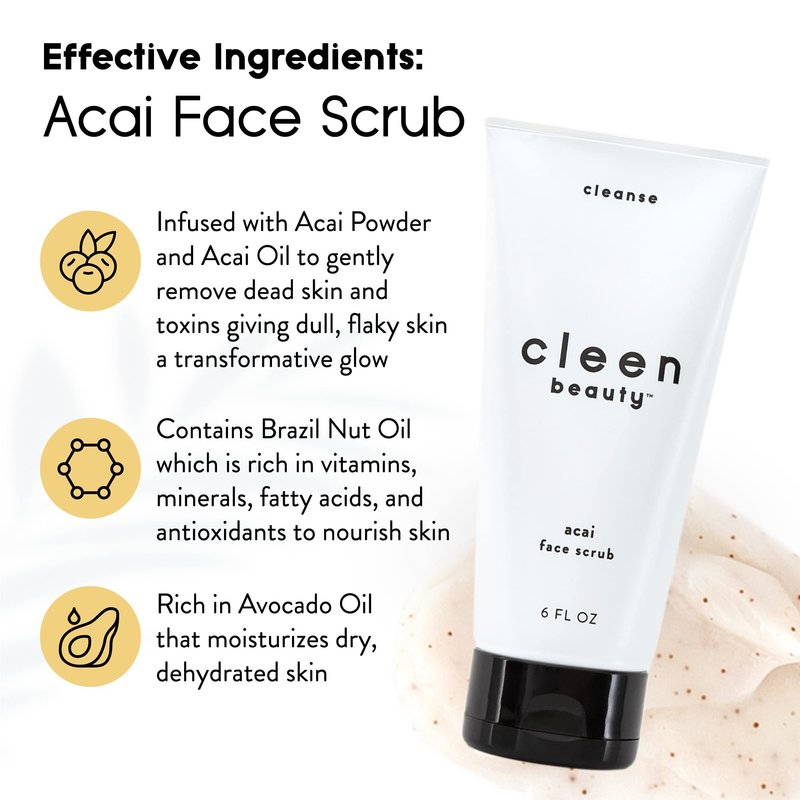 - Facial Exfoliator - The Cleen Beauty Acai Face Exfoliating Scrub is formulated with powerful ingredients to help scrub away impurities and leave clean skin behind. The scrub is infused with acai powder and oil to gently remove dead skin and toxins giving dull, flaky skin a transformative glow.