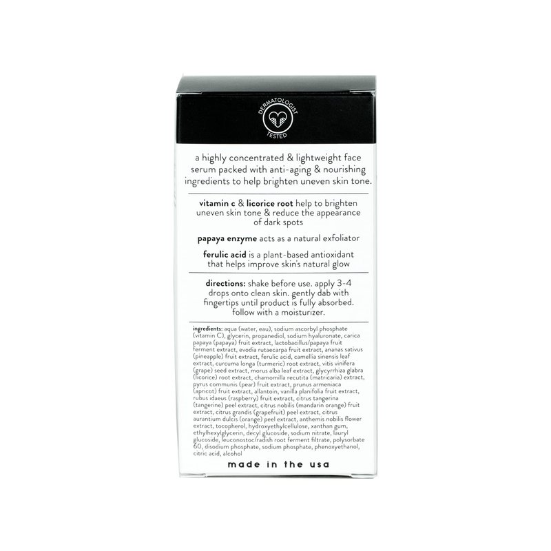 - Clean Formula - We use only the highest quality, natural ingredients to achieve clean and effective formulas for everyone. The Vitamin C brightening serum is dermatologist tested, cruelty-free, and vegan. Our face serums are formulated without parabens, phthalates, mineral oil, synthetic fragrances, and dyes.