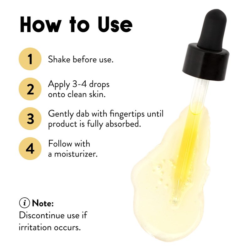 Brighten and exfoliate your skin in just a few simple steps! First, shake the bottle before use. Then apply 3-4 drops of the facial Vitamin C serum onto clean skin. Gently dab with your fingertips until the product is fully absorbed. Lastly, follow with a moisturizer. If irritation occurs, discontinue use.