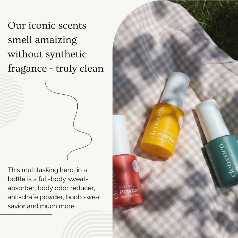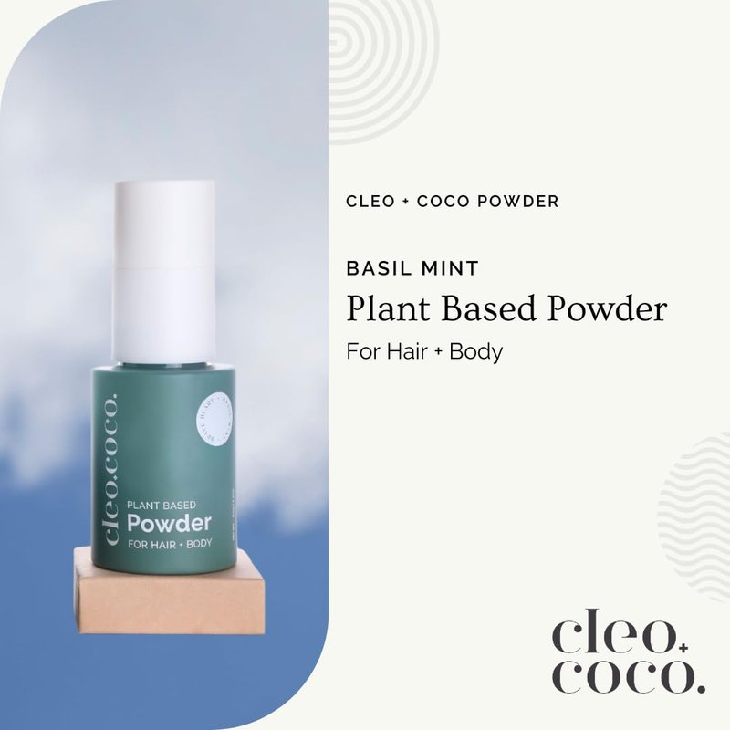 Cleo+Coco Dry Shampoo & Body Powder for women and men is made with plant-based powders, charcoal, quality essential oils and no synthetic fragrances. This talc-free powder absorbs oils, odors and sweat - helping you stay fresh, all day long. Use it on your hair, feet, underarms, underboob, underwear, anywhere. It does it all. So you can, too. This dry shampoo powder is volume-enhancing and absorbs oils, leaving your hair feeling clean and nourished. Simply sprinkle on hair and scalp to absorb oil and enliven second (or third) day hair. This product is also safe to use anywhere on your body. This multitasking hero, in a bottle is a full-body sweat-absorber, body odor reducer, anti-chafe powder, boob sweat savior and much more. Safe to use in the groin area, on your feet, underarms or on your chest keeping you fresh and naturally dry. Cleo+Coco dry shampoo is vegan, cruelty, benzene, aerosol and talc free. At Cleo+Coco, we are committed to sustainability as our deodorants are packaged in Post-Consumer Recycled (PCR) material. Our dry shampoo powder also comes in a convenient pump bottle, perfect for on the go or at home. Crafted with mood-boosting essential oils and no synthetic fragrances or perfumes. Classic and fresh with energizing notes of sweet basil, sharp peppermint and bright orange.