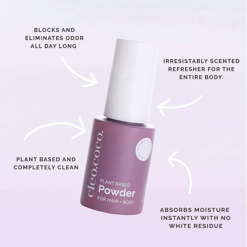 - ALL NATURAL - Cleo+Coco Dry Shampoo & Body Powder for women and men is made with plant-based powders, charcoal, quality essential oils and no synthetic fragrances. This talc-free powder absorbs oils, odors and sweat - helping you stay fresh, all day long. Use it on your hair, feet, underarms, underboob, underwear, anywhere. It does it all. So you can, too.