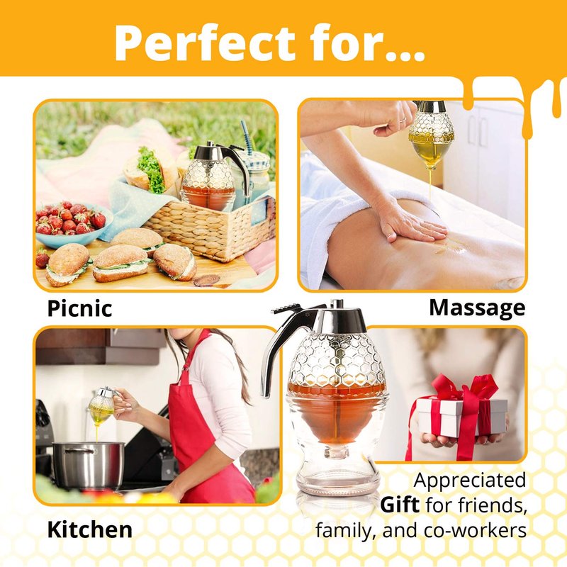 - Improved bottom flow honey dispenser means no waiting to pour honey. Simply remove the stopper on the bottom of the container. Press on trigger and honey immediately dispenses. Bottom stand included.
