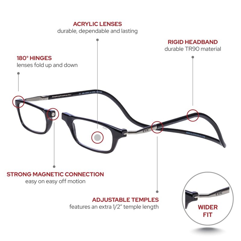- UNRIVALED DURABILITY. Your CliC readers are manufactured with high-impact acrylic lenses, strong neodymium magnets, and a durable TR90 wrap-around rigid headband strap. Along with our unique 180 degree hinges that allow each lens to fold upward towards the frame or straight down around the neck. CliC glasses are built with the expectation that you'll be wearing them for years to come.