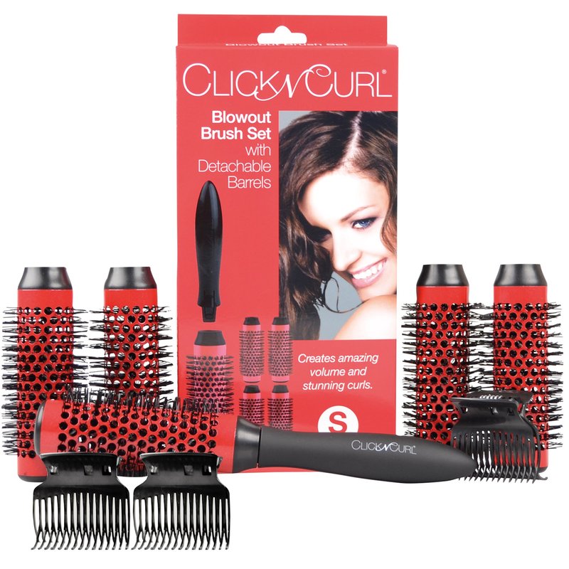 - ► Click n Curl Small Blowout Brush Set includes 5 detachable, lightweight barrels and a universal handle that features an easy release button and fits all sizes of Click n Curl barrels. Also included in the Full Set are 3 barrel clips.