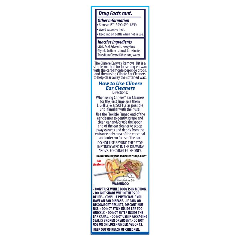 - HOW IT WORKS When drops are placed in the ear, the carbamide peroxide will break down the earwax by releasing oxygen. Once broken down, earwax can be removed using the provided Clinere Tool.