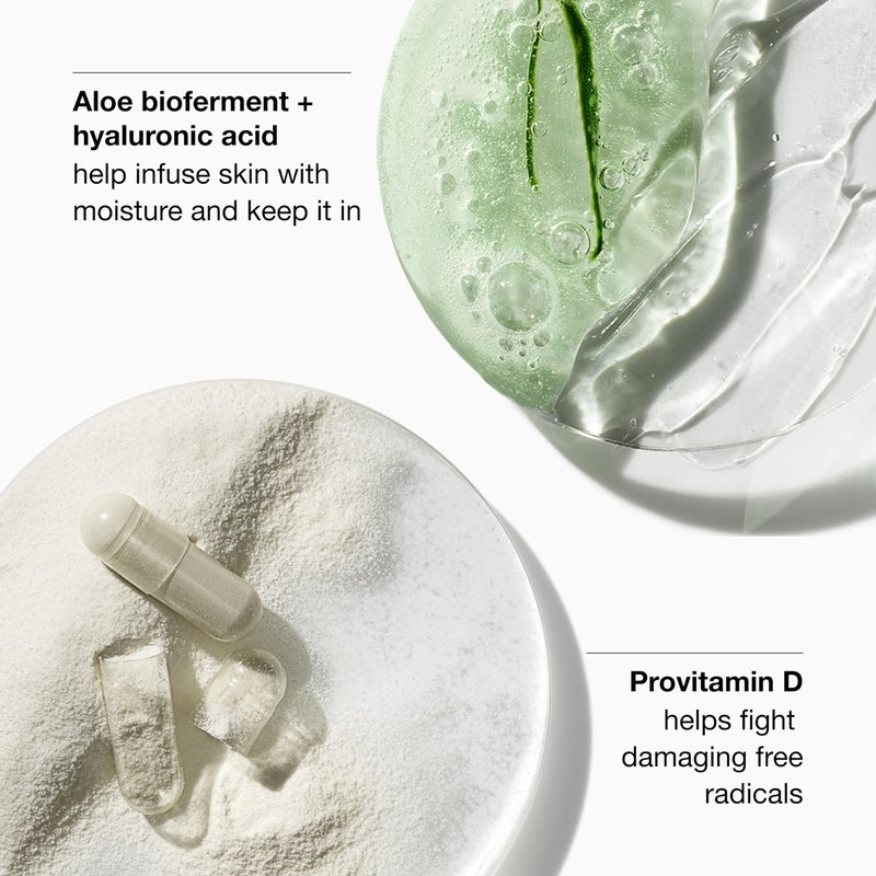 - FACIAL MOISTURIZER WITH ALOE BIOFERMENT + HYALURONIC ACID: Hydrating duo helps infuse skin with moisture and keep it in. Plus, provitamin D helps fortify skin’s free radical defense.