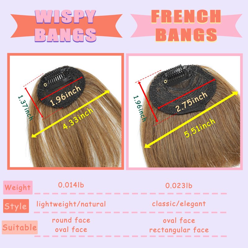 Wispy Bangs: Features: Wispy bangs typically refer to light, natural bangs that appear unadorned and free, giving the impression of being gently tousled by a breeze. Length: Generally, wispy bangs are of a relatively longer length, not covering the entire forehead but delicately resting on the front forehead. Style: The styling of these bangs emphasizes a natural look, avoiding excessive thickness or heaviness. It suits individuals seeking a relaxed and casual vibe. French Bangs: Features: French bangs are usually more elongated, exhibiting layers and presenting a refined design that exudes a sense of French elegance. Length: The length of French bangs can vary, but they are typically shorter than wispy bangs, sometimes slightly covering the forehead. Style: This type of bangs often requires some styling and grooming to maintain a neat and orderly appearance. It is suitable for those who appreciate classic and elegant styles.
