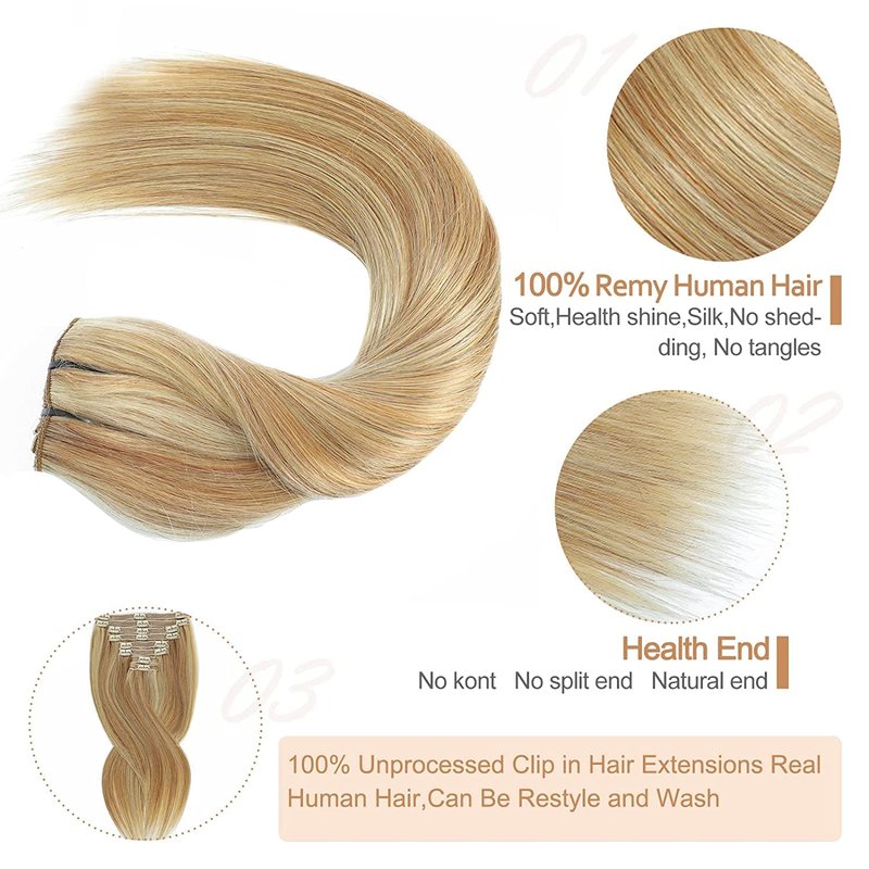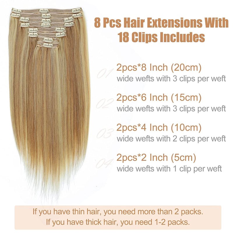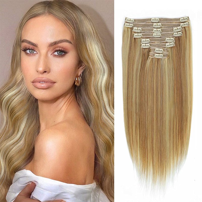 Clip in Hair Extensions 120g Dark Blonde Highlighted Bleach Blonde Clip in Hair Extensions Real Human Hair 8PCS Straight Double Weft Human Hair Clip in Hair Extensions(18/613,14inch)