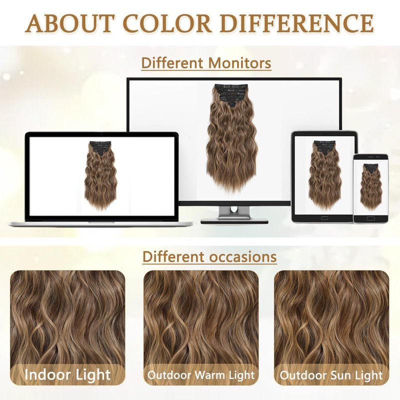 We are a brand focusing on the production and sale of hair products, Clip in hair extensions is one of the easiest and quickest way to change your hair style and color without causing damage to your own hair, to improved your self-confidence! Great for daily use, parties, weddings, cosplay and other occasions. Our curly wavy clip in hair extensions are made of High-Quality Heat-Resisting Synthetic Fiber, so this makes them have human hair clip in extensions feelings. This clip hair extension is soft and smooth, easy to comb and not easy to knot, and suitable for women and girls with thinning hair, wear it to make your hair look more natural. There are more different colors for your option, such as dark brown hair extensions, black blonde white hair extensions clip in. Great Quality of the Hair Extensions:This hair extensions are very soft and not overly shiny. The clips are strong and hold well.The clip in hair extensions are extremely well made,Not only are these full and beautiful and thick hair but they are so comefortable!They also don't get tangled up as easily as the other ones do.The most important is this set does not have any strange smell like many other sets you had before. Easy for Install: Clip in hair extensions are so easy to apply that almost anyone can put them in without external help. Even if you’ve never worn extensions, you will be able to add length and color to your hair in a few simple steps. All you need to do is part and separate your hair, push in the extension, attach the weft with a small comb, and snap the clip down. How to Care: Unlike your own hair, hair extensions may become tangled without nutrients. Use a detangling spray, or take a spray bottle and put some conditioner in it and add water. If there is no conditioner, just spray some water, so that the hair extension will not be very dry and prevent tangles to a certain extent. We are committed to providing each customer the super quality clip in hair extensions products wit.
