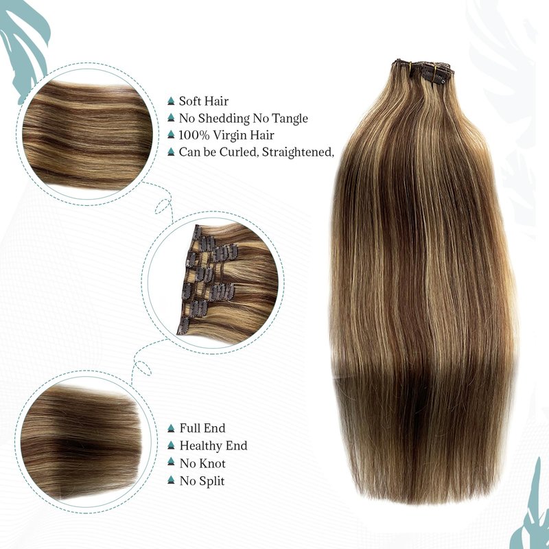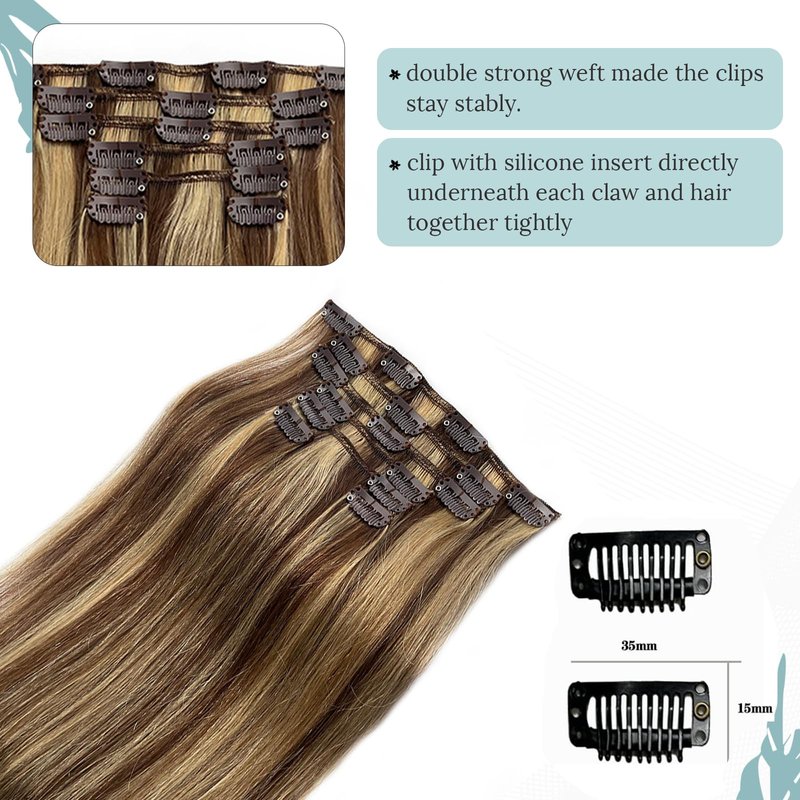 - 【Top Quality Remy Human Hair】-- Our clip in real hair extensions made of 100% real human hair with finished length 15-22 inches, which are one of the best quality clip in human hair extensions on the market. Soft and silky, smooth and shinny, our Remy Human Hair Extensions looks very natural, which would match your hair color prefectly, like your own hair.
