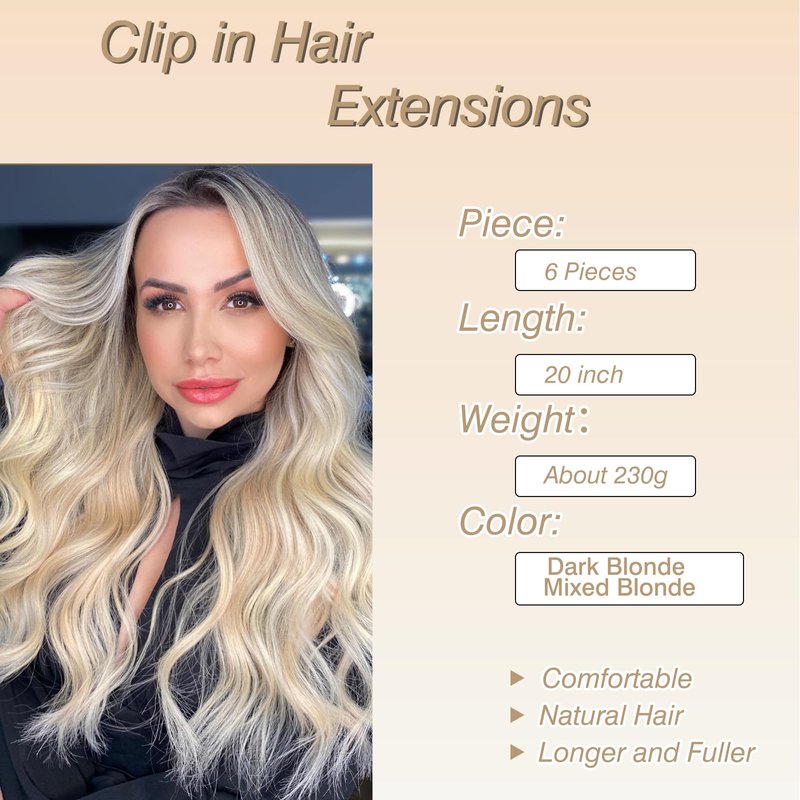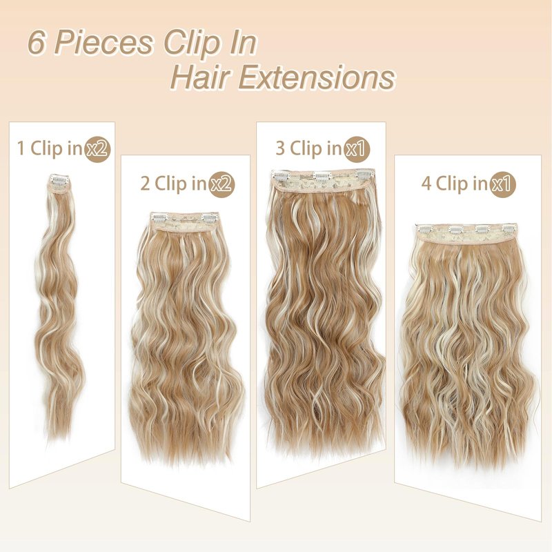 Clip in Hair Extensions Long Wavy Synthetic Hairpieces 20 Inch Ash Blonde Mix Bleach Blonde 6PCS Thick Hairpieces Fiber Double Weft Hair for Women