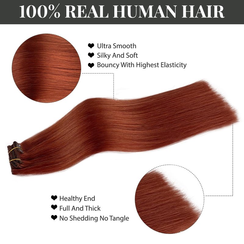 Clip in Hair Extensions Real Human Hair, Auburn Hair Extensions Clip in Straight Human Hair, 7 Pcs 70G Double Weft Silky Human Hair Clip in Extensions for Women #135 20 Inch