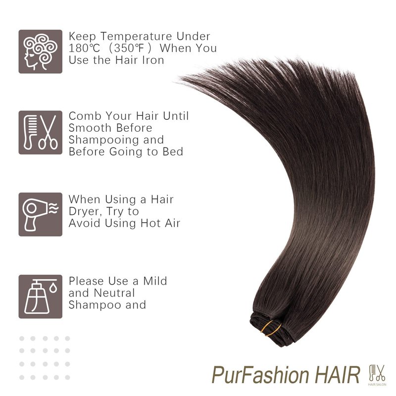 - 【100% Real Remy Human Hair, Long-Lasting and Reusable】100% human hair extensions clip ins. Thick & Full ends, natural silky appearance and soft touch, shiny, no tangles, no shedding. This human hair clip in extensions is the same as our own hair. Our seamless clip ins for women needs careful care to make it last 2-7 months. please refer to details of cleaning and maintenance in 5th product page and instructions.