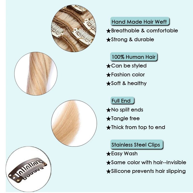 - How to Maintain and Wash--Real blonde hair extensions are washable and easy to maintain; please wash the hair gently and make sure no conditioner touch your scalp or the clip area, and the extensions stay in tact.